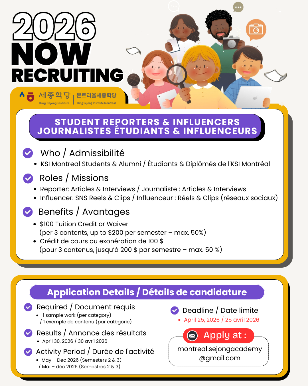 Comment postuler : Envoyez 1 exemple de contenu par catégorie à montreal.sejongacademy@gmail.com