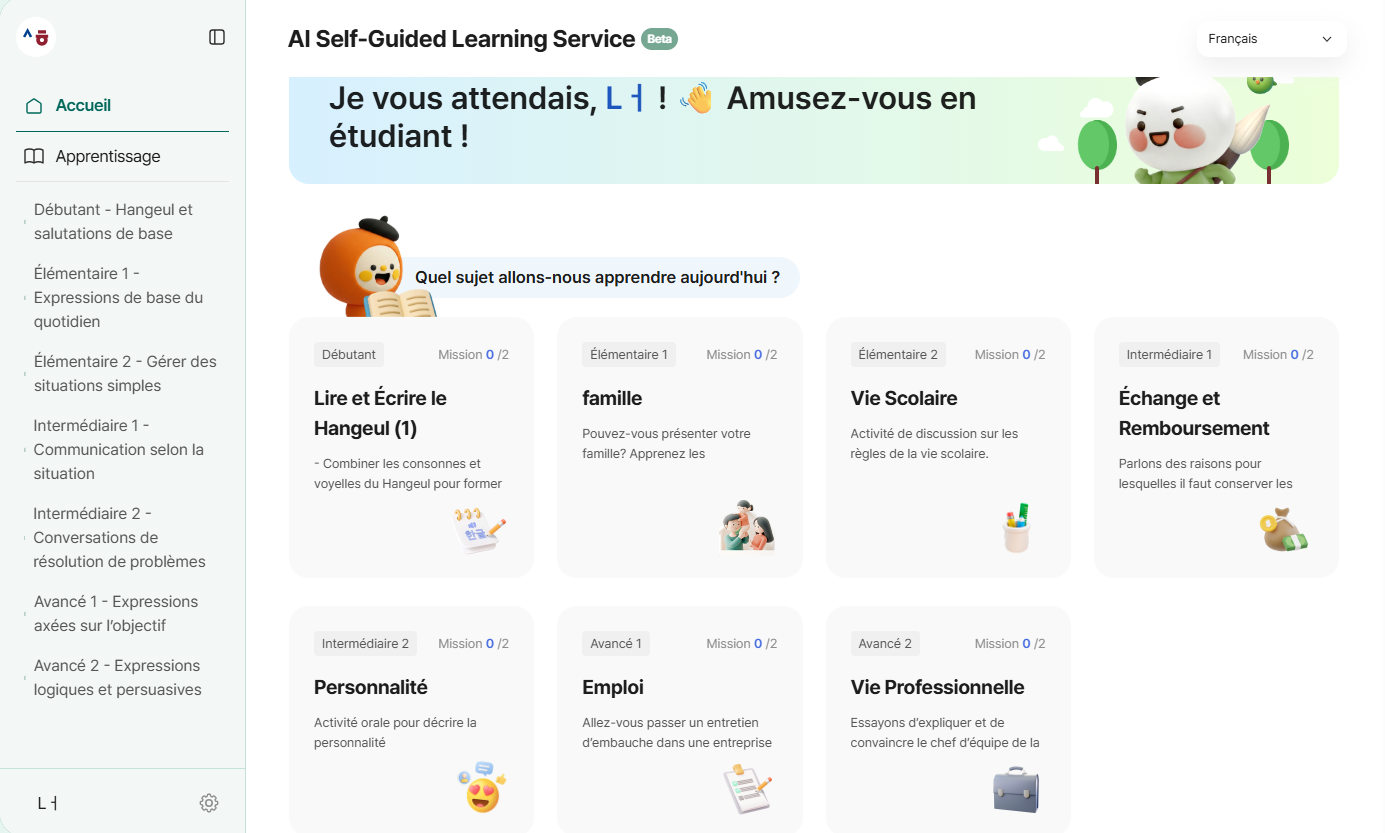 Nous avons le plaisir de vous annoncer le lancement de notre Service d’auto-apprentissage par l’IA (Bêta). Que vous soyez débutant ou avancé, notre plateforme vous aide à progresser en coréen par l’écoute, l’expression orale, la lecture et l’écriture.