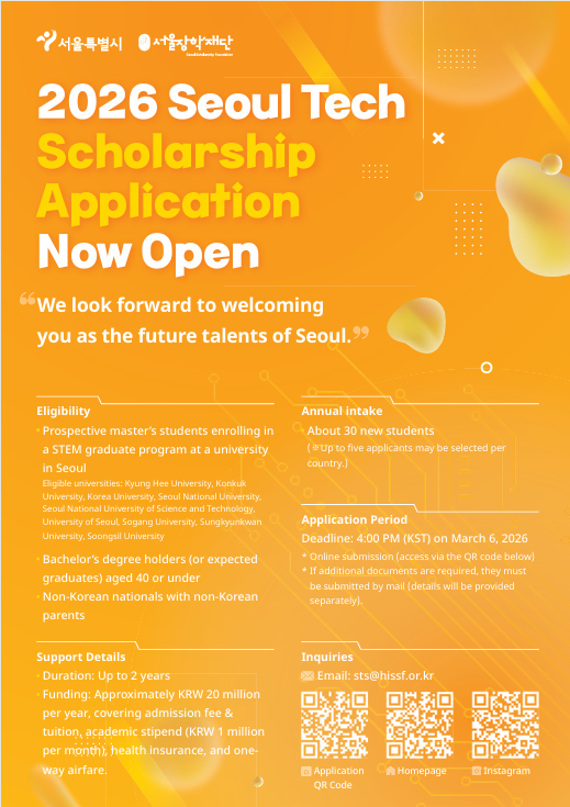 The Seoul Metropolitan Government has opened applications for the 2026 Seoul Tech Scholarship, a program supporting outstanding international students pursuing master’s degrees in science and engineering fields at graduate schools in Seoul.